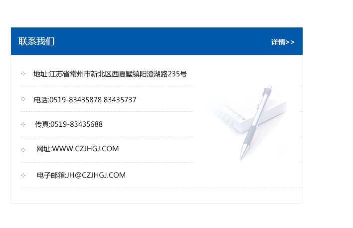 地址:常州市新北區友邦商務大廈1幢16、17層  電話:0519-85101652  傳真:0519-85112595  郵編:213022  網址:www_cz-jiayue_cn.hjhxjx.com  郵箱:xiajifengaa@163.com